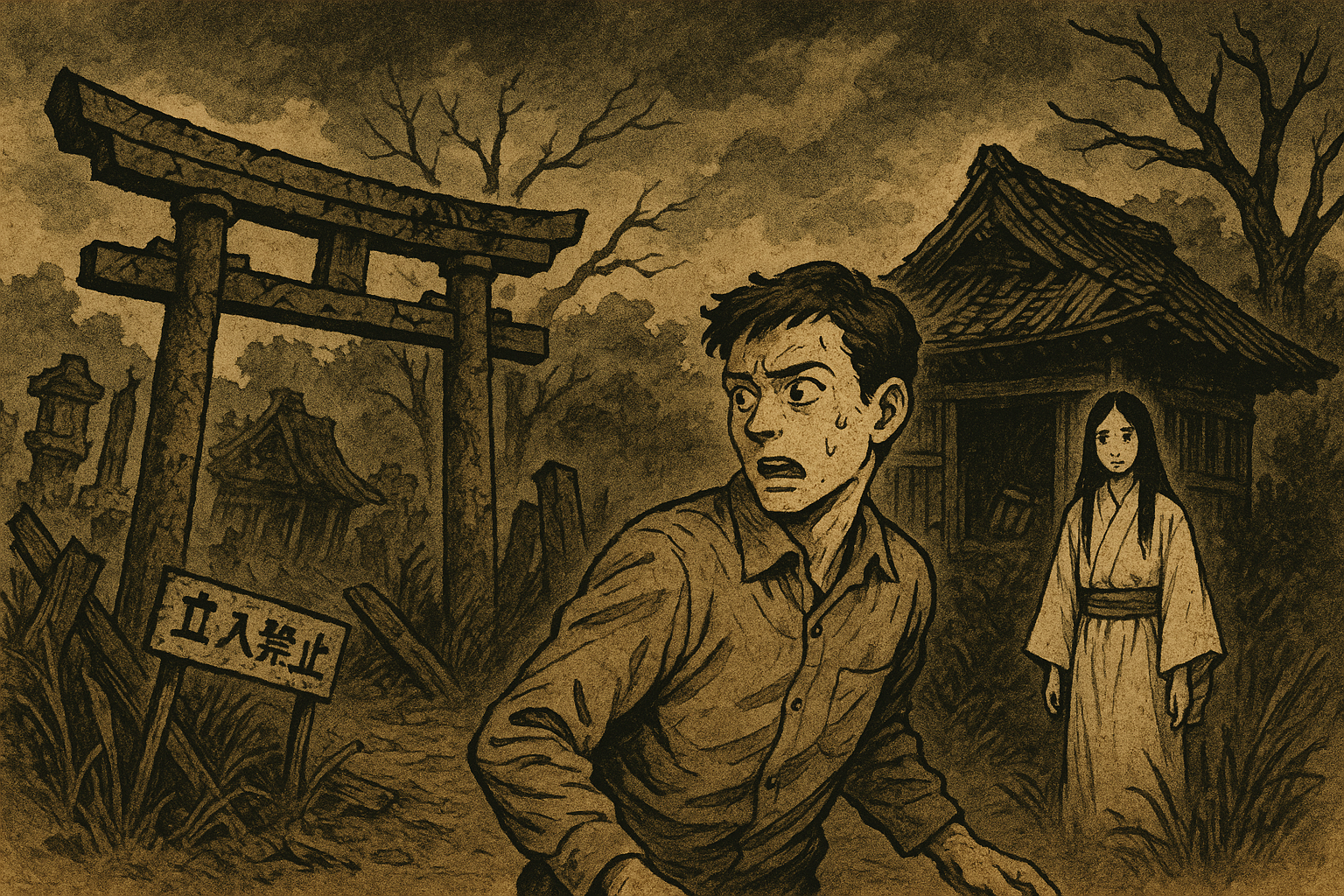自分の足元には、朽ちた鳥居の残骸と、折れた看板が転がっている。