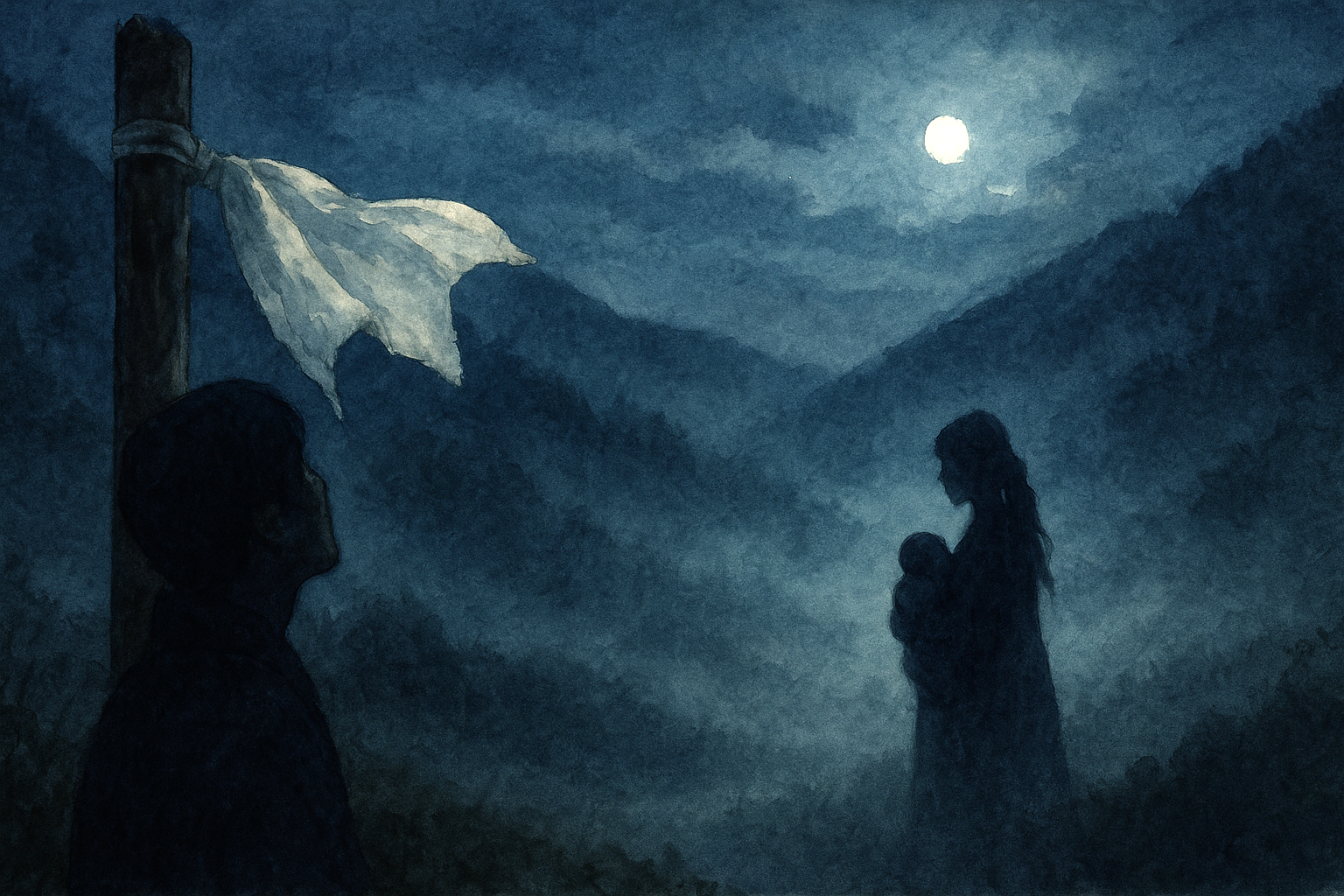 彼女は境の杭で立ち止まった。布を一枚、結び直した。結び目を撫で、輪を作り、最後にほどくように止めた。私は息を詰めた。子は静かで、目を閉じ、口だけ動かした。舌が覗く。彼女は私の手首を軽くつまんだ。「越えると、戻れないよ」と彼女は言った。私は頷いた。頷いた回数は一度。喉元が上下した。彼女は「言葉を変えて」と言った。私は唇の形を変え、音の高さを変えた。谷が近づく。冷えが膝まで上がる。私は一度だけ振り返った。誰もいない。黒い舟が机の上に浮かんでいる気がした。