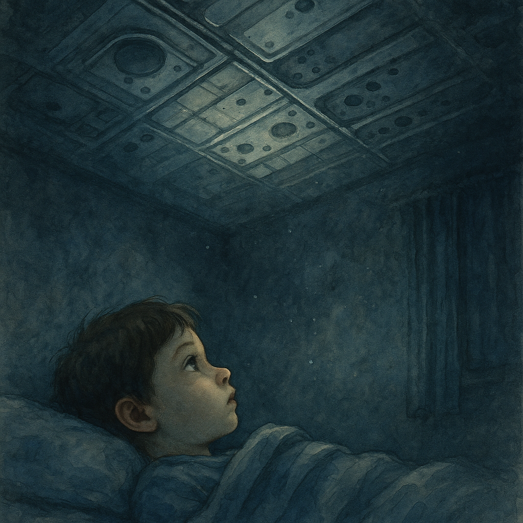 小さな体をベッドに沈めると、目の前には白い平面が広がる。無地のようで、近づくと筆のかすれや塗りムラが見える。そこに淡い影が流れていくのが好きだった。外の街灯がカーテンの隙間を縫い、天井の角に微妙なグラデーションを作る。呼吸のたびに影が揺れ、天井全体が生き物のように波打つ気がした。