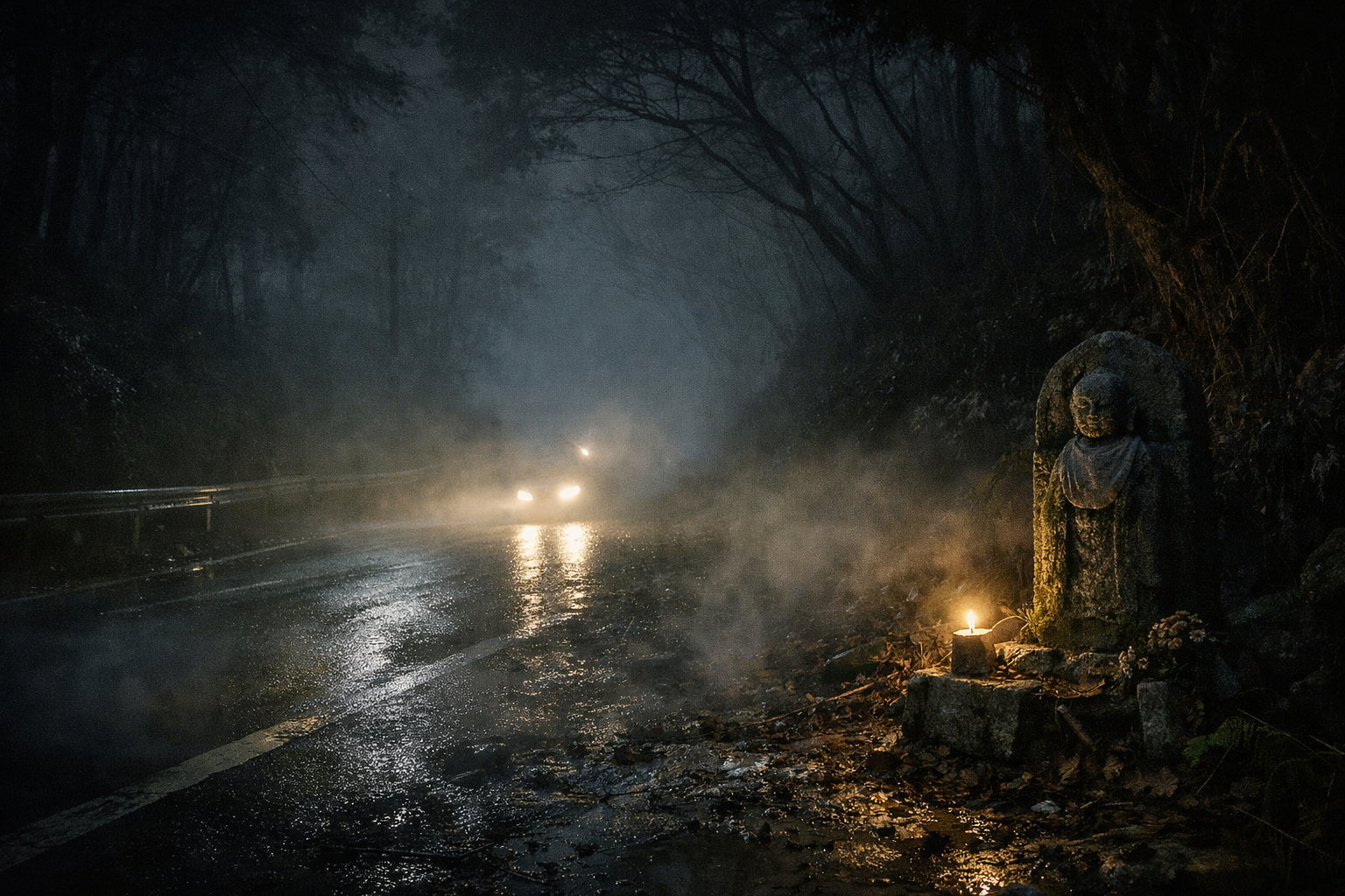 街灯の切れた峠道は、昼間と違って肌に貼りつくような匂いを放っていた。