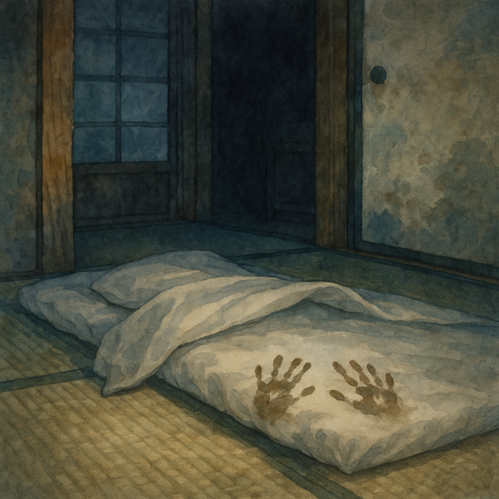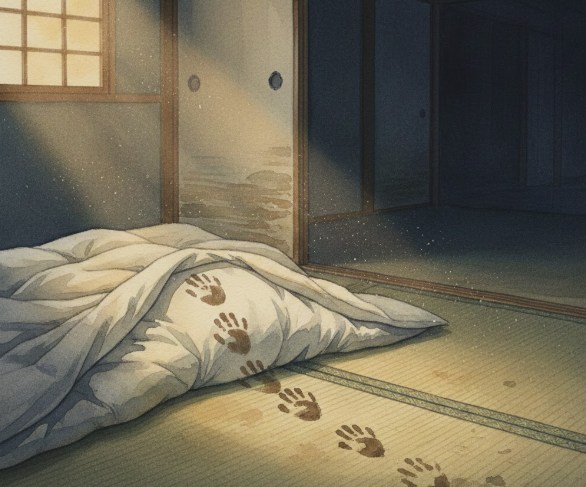 Aが布団を下ろそうとしたその時、布団の内側――自分の足が触れていた白い内布に、五つの泥の指跡が並んでいるのが目に入った。