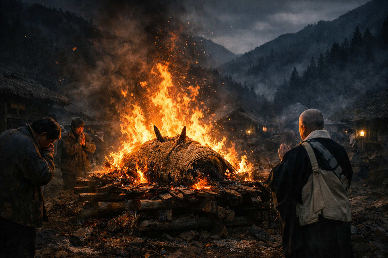 その夜、村人たちは寺から僧を呼び、経を途切れさせなかった。火は夜明けまで燃え続け、薪が尽きた頃には、そこには灰しか残っていなかった。拾い上げられるはずの骨は、どれも指で崩れ、形を保つものはなかった。