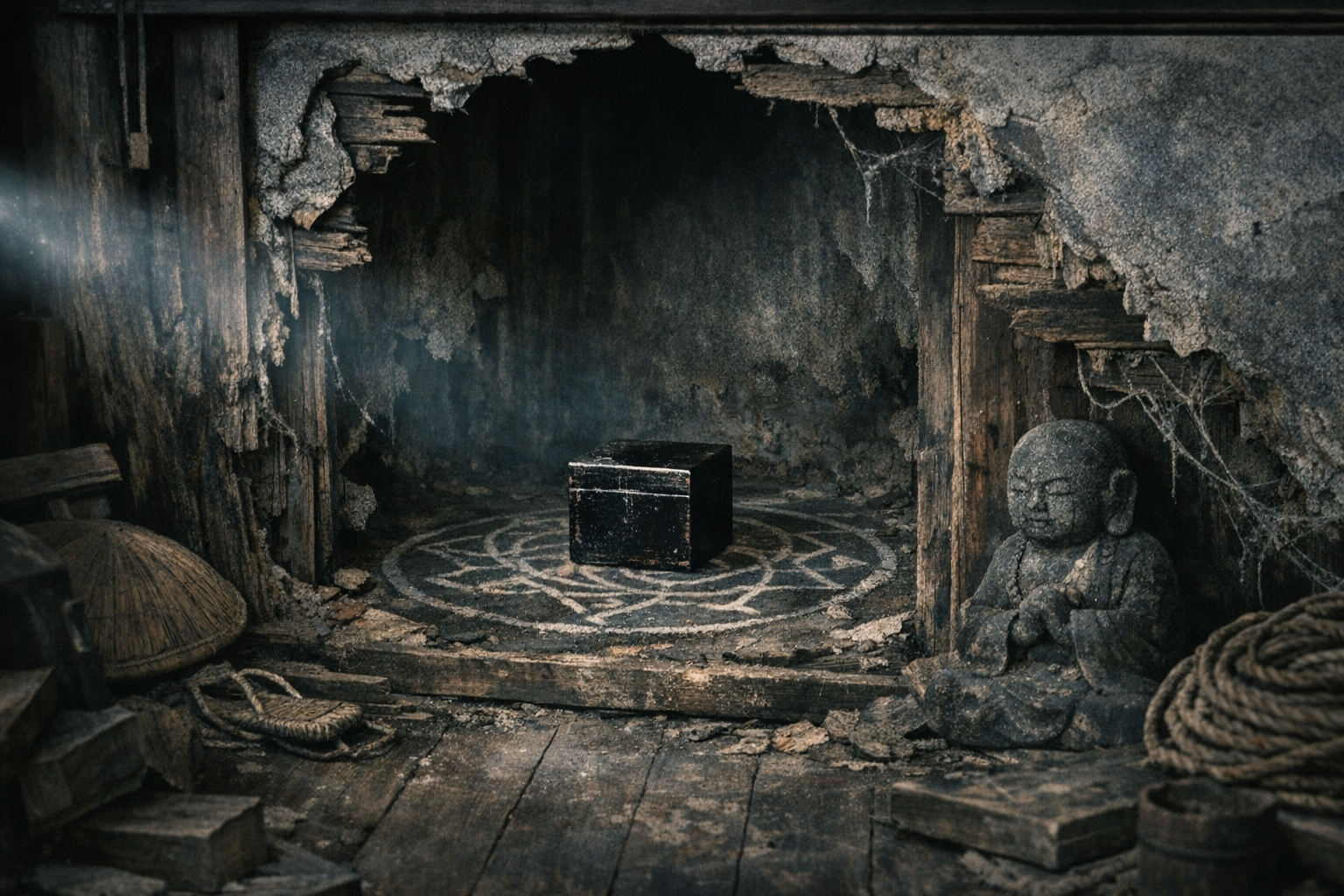 夜九時過ぎ、父と一緒に懐中電灯を持って蔵へ向かった。隙間から光を差し込んだ瞬間、はっきりと見えた。奥に、小さな箱が置かれていた。三十センチ四方ほどの、黒光りする箱だ。漆を塗ったような艶があり、古いのに傷が少ない。