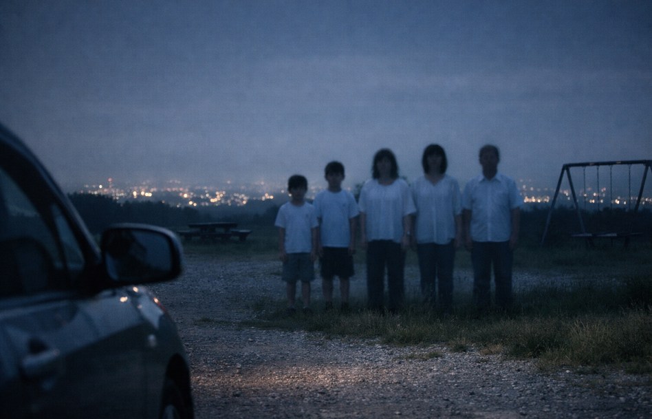 外を見ると、白い服の親子4人が、門の前に並んで立っていた。