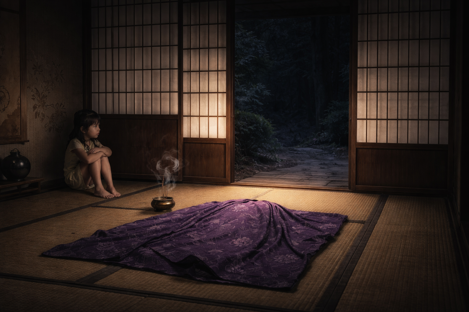 最後に辿り着いたのは、小さな部屋だった。茶室のようでもあり、違うようでもあった。障子越しに柔らかな光が入り、床の間には掛け軸があり、生花を置くはずの場所には、紫色の布が丁寧に畳まれていた。