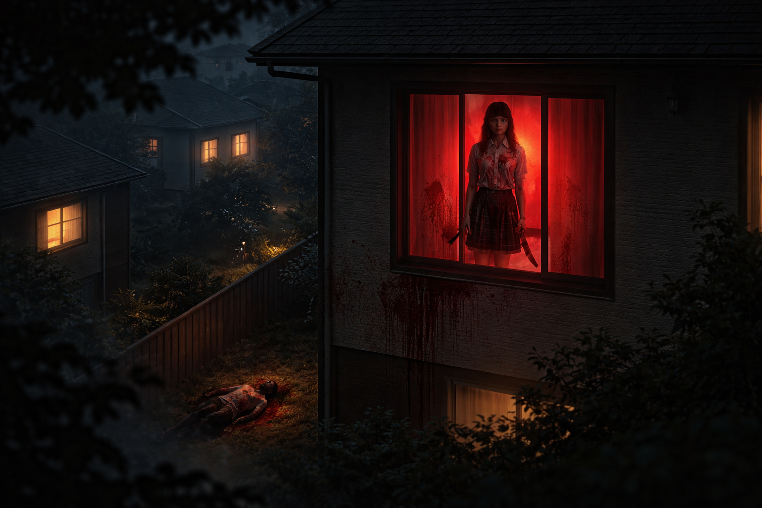 窓の下には、その男と思しき人物が倒れていた。白いシャツは赤く染まり、動かない。彼女の右手には、銀色の何かが握られていた。刃物だと理解するまで、時間はかからなかった。
