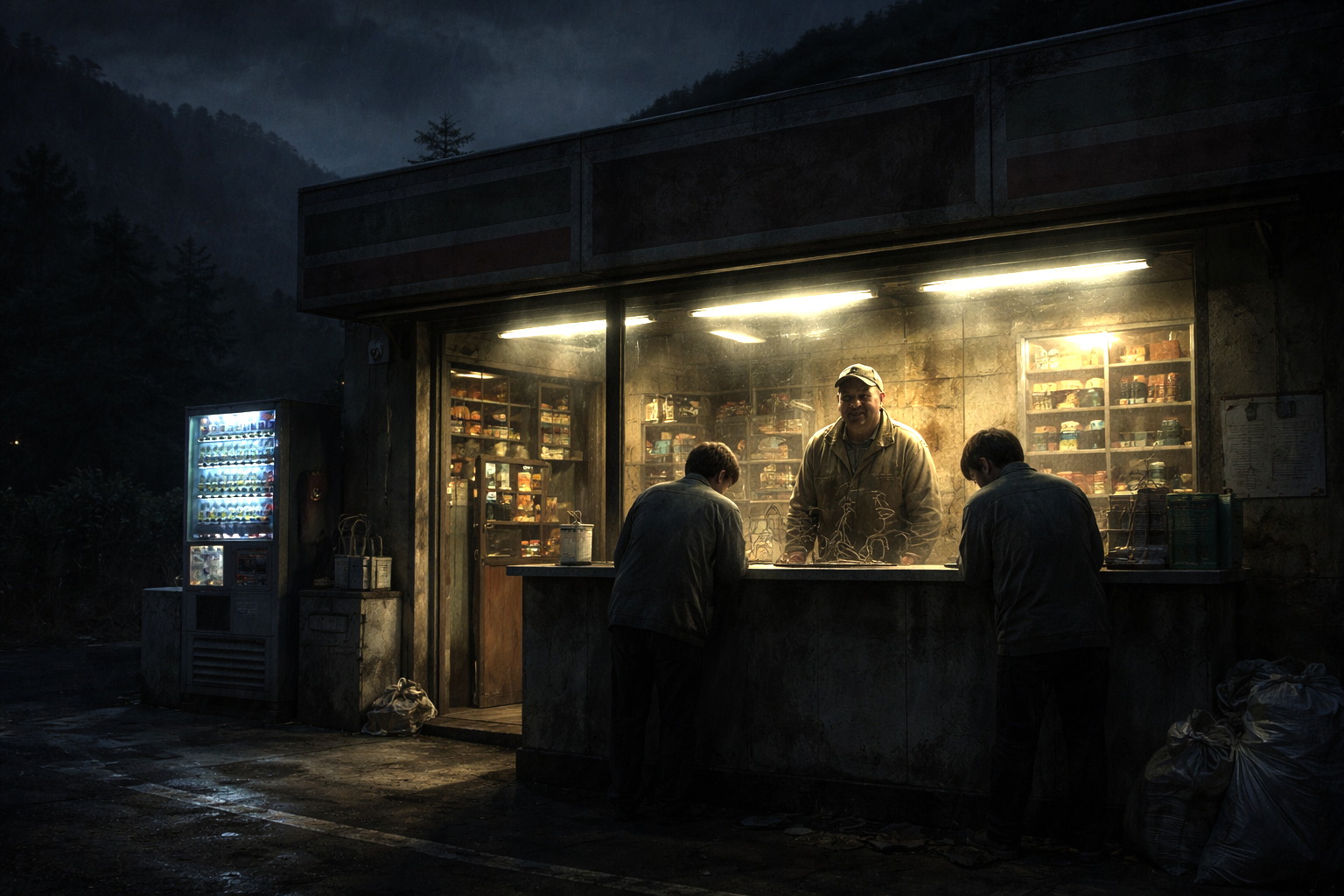ある夜、Kという男が後輩と二人で夜勤に入っていた。深夜一時を回り、客足も途絶え、二人はバックヤードで廃棄前の弁当をつつきながら煙草を吸っていた。