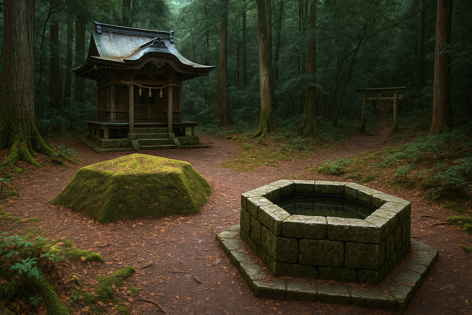 その社には、奇妙な造りのものがいくつかあった。まず社殿の裏に回ると、そこだけ土が盛り上がっていて、ちょうど小さな丘のようになっている。ふざけ半分でよじ登ると、見下ろした足元が妙に整っているのに気づいた。まるで人工的に積まれたような土の感触。よく見ると、それは正確な正五角形の形をしていた。