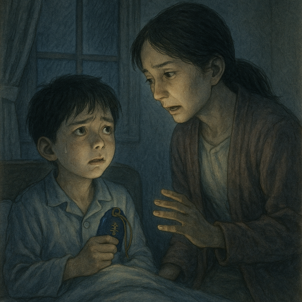 恐怖で頭が真っ白になりながらも、僕は机の引き出しを開け、お守りを掴んだ。だが、また肩を掴まれ、意識が遠のきかけたその時――襖が開き、母が飛び込んできた。