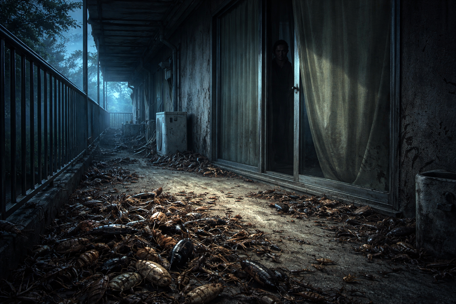 角部屋というより、建物の裏側に貼り付くような位置だ。ベランダの柵を一つ越えると、裏口へ続く細い通路があり、昼でも薄暗い。住人はほとんど使わず、管理人ですら滅多に通らないらしい。各部屋のガラス戸には厚手のカーテンが掛けられ、外から中の様子はまず分からない。