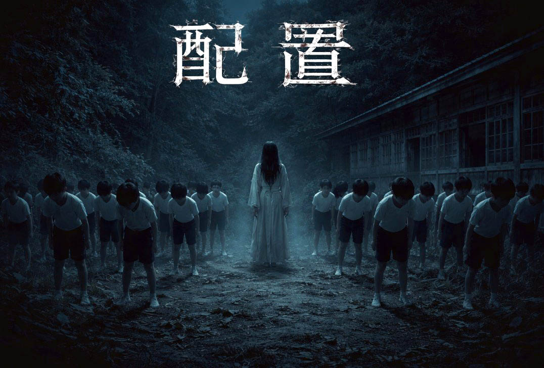 二十人ほど。全員がトレパン姿で中腰になり、同じ向き、同じ間隔、同じ角度で静止している。その列の中央に、白い着物を着た長髪の女が立っていた。