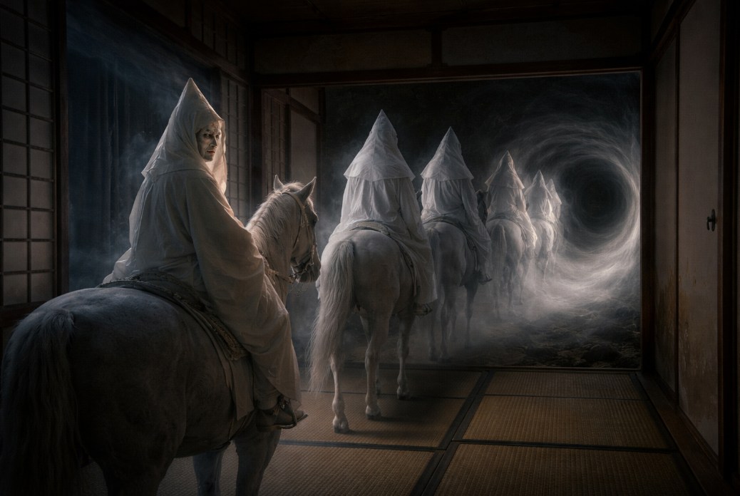 二頭、三頭、数を数える余裕はなかったが、気づけば六頭ほどになっていた。白い馬に乗った白い影たちは、音も立てず、列をなして部屋を横切っていく。風はないのに、衣の端だけがゆっくり揺れていた。