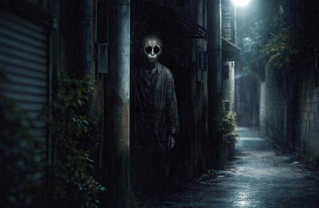 奇妙なのは、その姿そのものよりも「目」だった。人混みの中でも、暗い路地でも、なぜか顔の空洞だけが異様にくっきりと目に入る。見ているというより、吸い寄せられている感覚に近いと彼は言った。