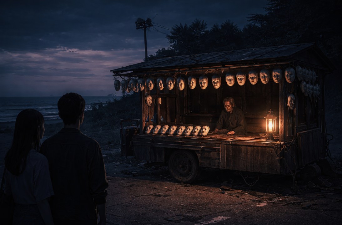 減速すると、道路脇の朽ちたドライブインの駐車場に、小さな屋台がぽつんとあった。リヤカーを改造したような屋台で、そこにはお面がぎっしりと吊るされている。どれも薄く笑っているような、無表情とも言える顔だった。色も形も微妙に違うのに、どこか同じ顔に見える。つやのないゴムのような質感が、街灯の光を吸い込んでいた。