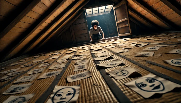 階段を登り、天井板を押すと拍子抜けするほど簡単に開いた。初めて入る天井裏は薄暗く、小さな窓から差し込む光の中で埃がゆっくり舞っていた。古びた箱や戸棚のようなものが点在している。