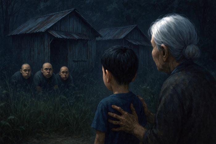 振り返ると、茂みの暗がりに三人の男が立っていた。身長は揃っていないのに、体つきは妙に似ていた。ずんぐりとした胴体、短い首、丸刈りの頭。ぎょろりと大きな目が、こちらをじっと見ている。顔の作りまで不自然に似通っていて、兄弟というより、同じ型で作られた人形のようだった。