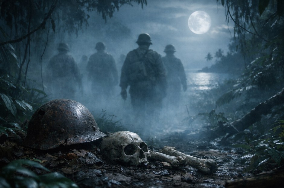 帰国してからも、湿った匂いと崩れた軍歌が、不意に蘇ることがある。ある晩、部屋の隅で遺影がわずかに揺れた。母方の祖父だ。戦中、南方で行方不明になった人間で、遺骨は戻らなかった。