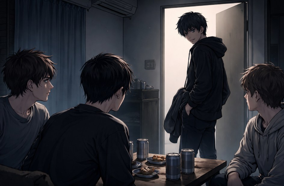 いつものように、僕らは僕の部屋に集まっていた。大学の講義が休みで、外は妙に暖かく、桜も中途半端に散り始めている。誰かが提案して集まったわけでもない。ただ、気づけばここにいる。テレビはつけず、テーブルの上には安いビールとコンビニのつまみ。会話も途切れ途切れで、沈黙が長くなるたびに缶を開ける音だけが響いた。