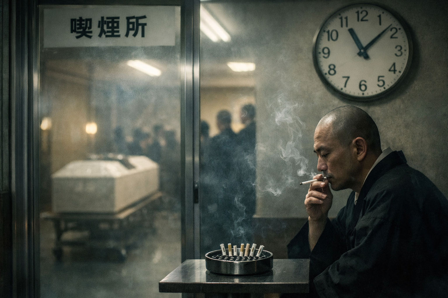 坊さんは煙草を消し、手を洗うでもなく、喫煙所を出ていった。扉が閉まると、外の静けさが戻ってきた。戻ってきたのに、喫煙所の中だけ、何かがまだ残っている。煙じゃない。匂いでもない。言葉の残りかすだ。