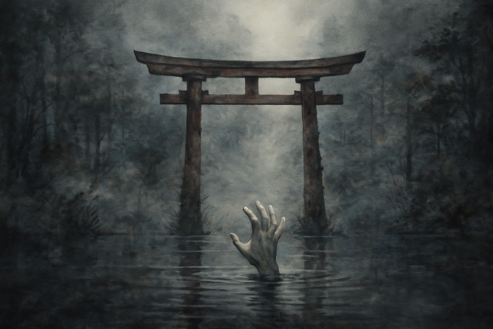 水面へ引き上げられる途中、視界の端で鳥居の上に影が立っていた。輪郭は夜の湿気で表面だけ光り、手が俺ではない別の方向へ伸びていた。救助してくれた大人の方へ。伸びながらも指が何度も折り返し、長さが少しずつ変わっていた。届かない距離を、形を変えて埋めようとしている。