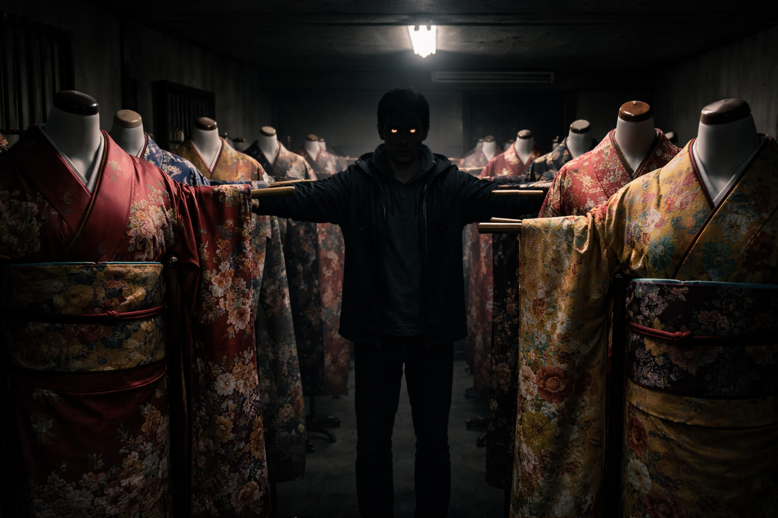 その列の間を、数歩だけ進んだ。風はないのに、どこかの袖がゆっくり揺れている。布の擦れる音が、紙やすりみたいに耳の内側をこする。視界の端で、また揺れた。奥のほう、朱色の帯が見える着物の影だ。
