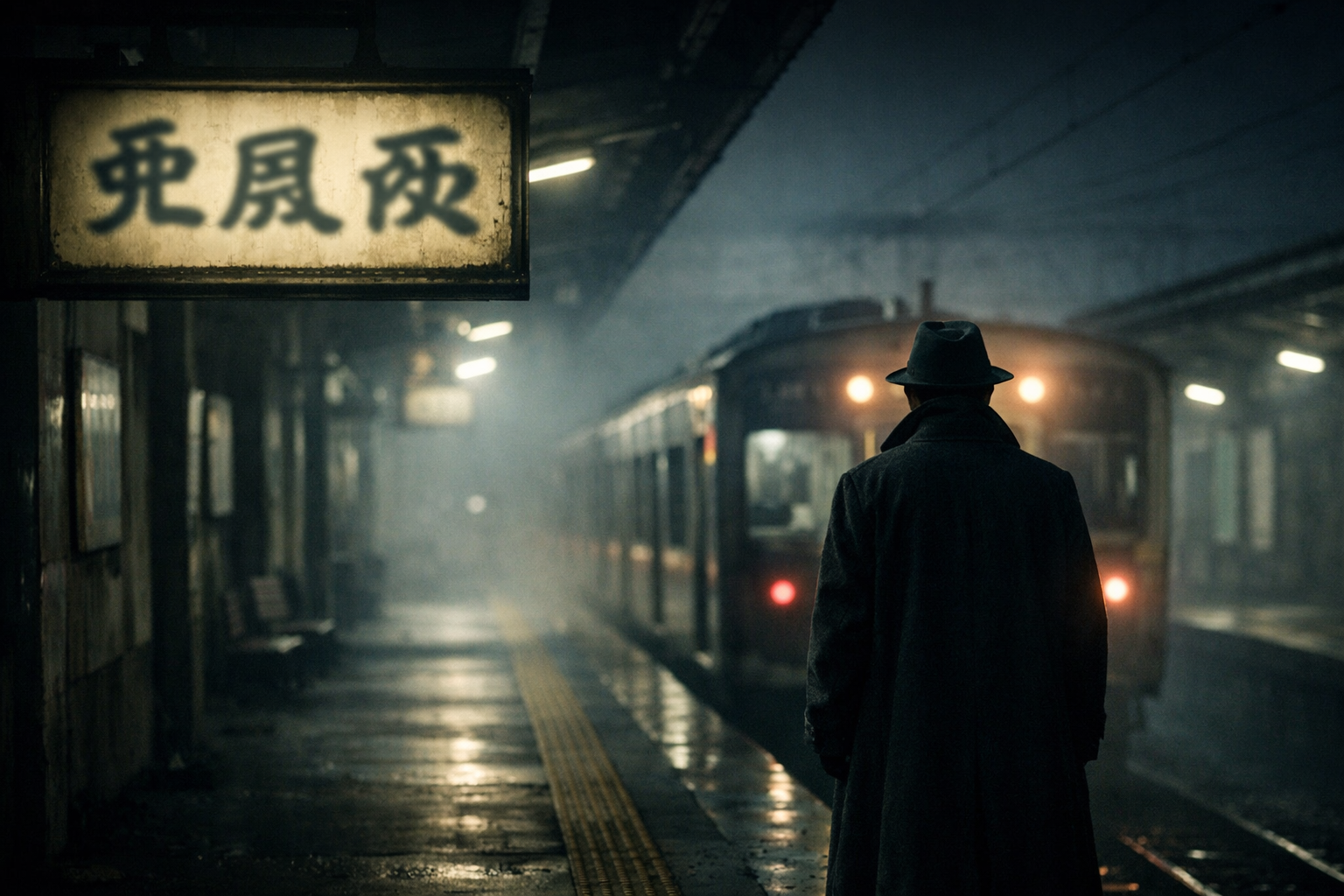 ホームの端に、電車の先頭に向かって立っている影があった。背筋を伸ばし、厚手のコートを着込んだ紳士風の姿。真夏の大阪でその服装は明らかに浮いている。声をかけようと一歩踏み出した、その瞬間だった。