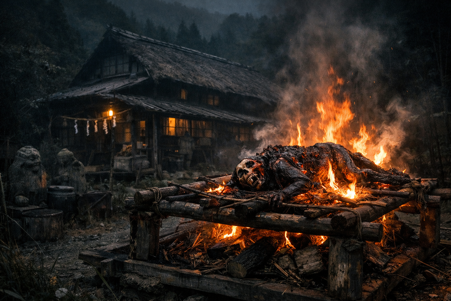 気づけば、猿は炭になっていた。これで終わりだと思った。だが、広間に戻ると、そこには宴の用意が整っていた。酒、飯、野菜。そして、焼かれた猿が中央に置かれていた。