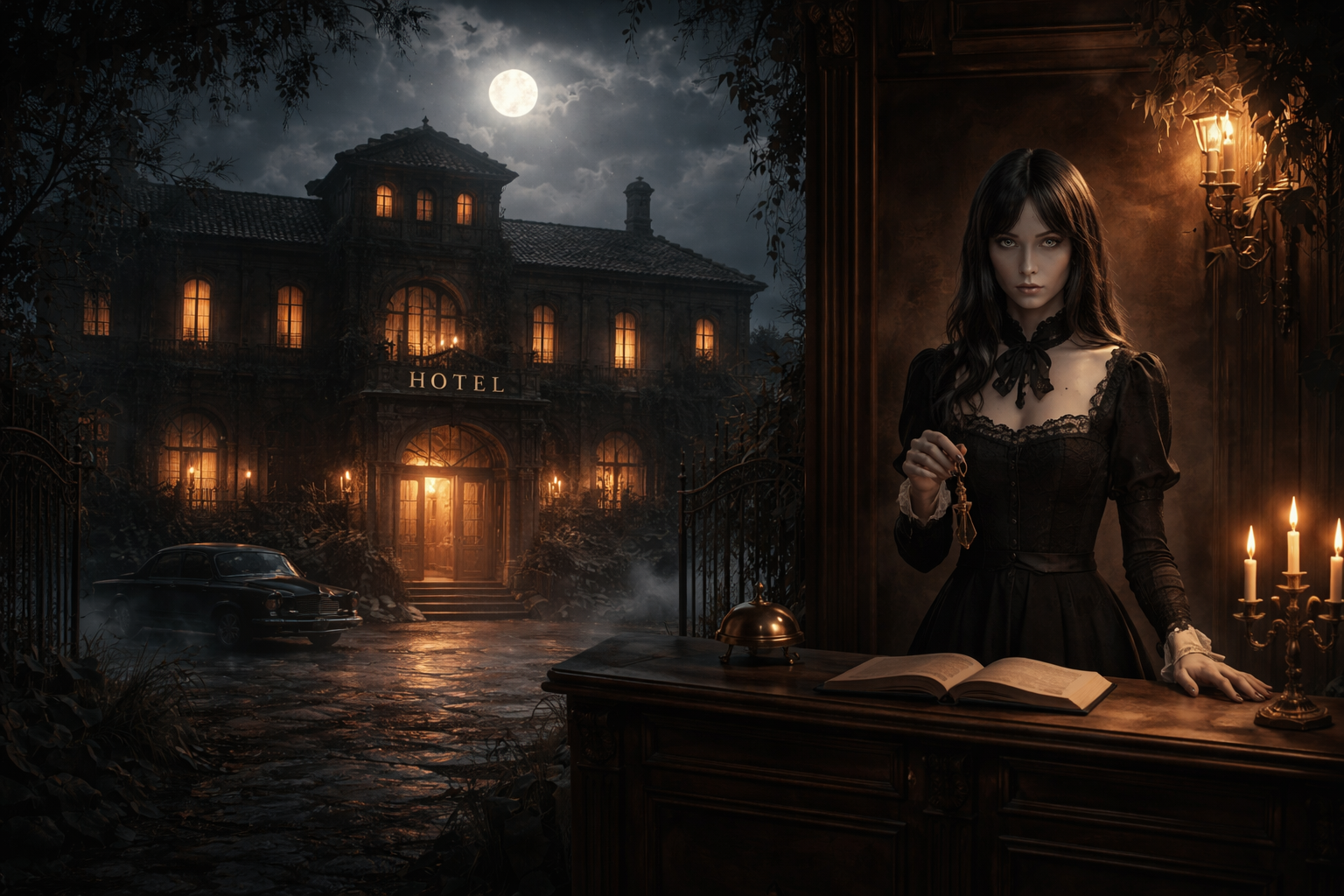 赤茶けたレンガ造りの、三階建ての洋館。正面には「Hotel」という文字が、錆びついた鉄細工の看板に刻まれている。建物の外壁には、太い蔦が血管のように絡みつき、夕闇に沈みかけた窓ガラスは、内部の光を拒絶するように黒々と光っていた。