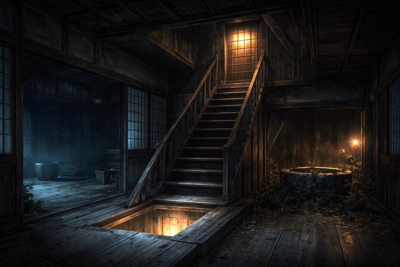 夜の静けさの中で、階段のきしむ音が聞こえる気がする。上でも下でもない位置から。