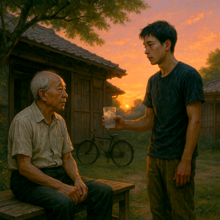 喉が渇いた旅人だろうと思った。この暑さだ。断る理由はない。軒先に招き、氷を入れた水をコップになみなみ注いで差し出す。男は目を細め、「ありがとうございます」と言って一気に飲み干した。その所作があまりに自然で、かえって作り物めいていた。