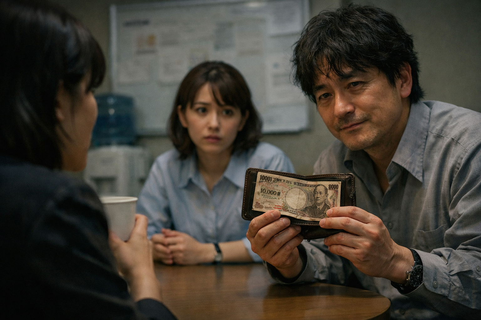 会社の休憩室で、紙コップのコーヒーを片手に。