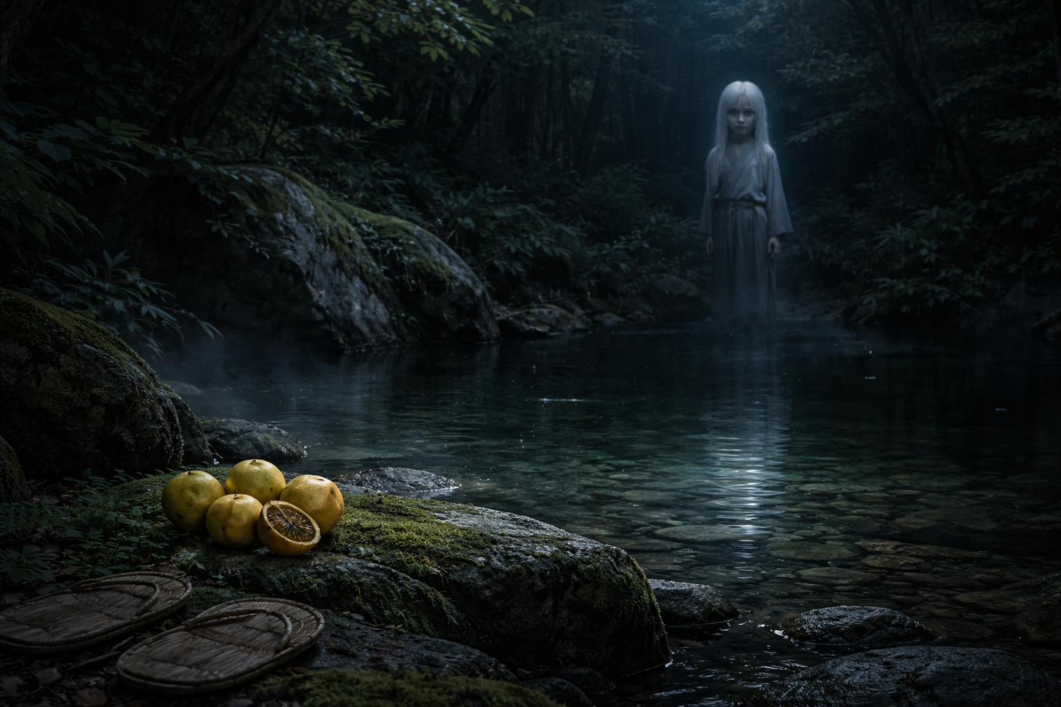 髪は腰のあたりまで白くのび、濡れたように貼りついていた。子供の顔なのに、目だけが年を取った人間みたいに冷えていた。浅葱色だった着物は色を失って、池の底の泥のように見えた。