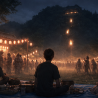 僕はやつとその横町を見つけ、ぬかるみの多い道を曲つて行つた。するといつか道を間違へ、青山斎場の前へ出てしまつた。それは彼是十年前にあつた夏目先生の告別式以来、一度も僕は門の前さへ通つたことのない建物だつた。十年前の僕も幸福ではなかつた。しかし少くとも平和だつた。僕は砂利を敷いた門の中を眺め、「漱石山房」の芭蕉を思ひ出しながら、何か僕の一生も一段落のついたことを感じない訣には行かなかつた。のみならずこの墓地の前へ十年目に僕をつれて来た何ものかを感じない訣にも行かなかつた。