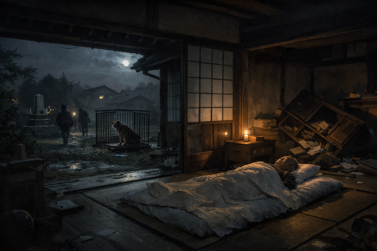 祖父が横たわっていた元の部屋は、揺れで棚が崩れ落ちて家具に潰されるような有様だった。そこに残っていたなら、確実に命を落としていただろう。親族が寝るはずだった客間も一部が崩れ、天井が抜け落ちていた。犬小屋は瓦礫の下敷きになっていて、檻に移していなければ助かるはずもなかった。