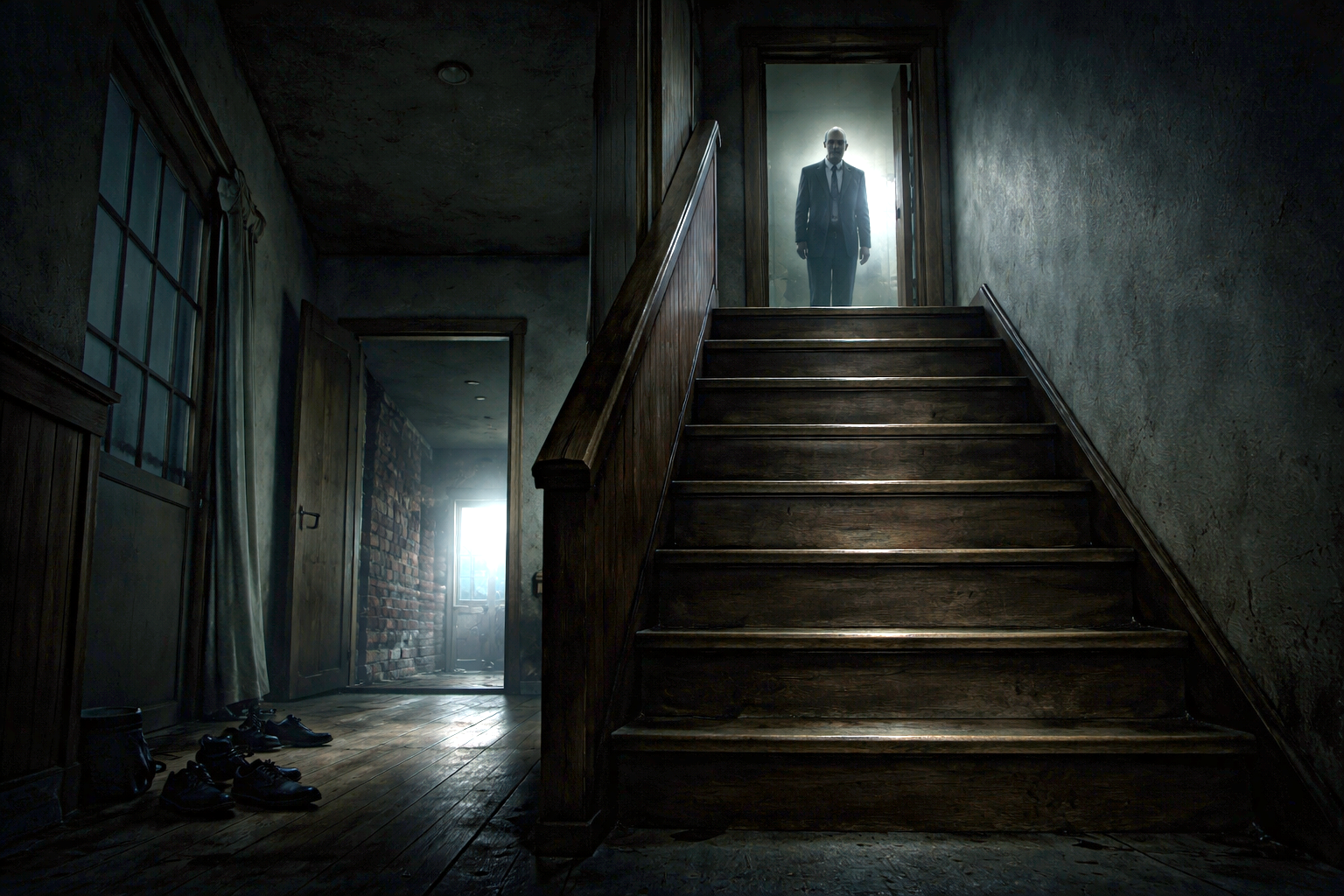二階の廊下は暗く、納戸の扉が半開きになっていた。中にはスーツ姿の男が立っている。
