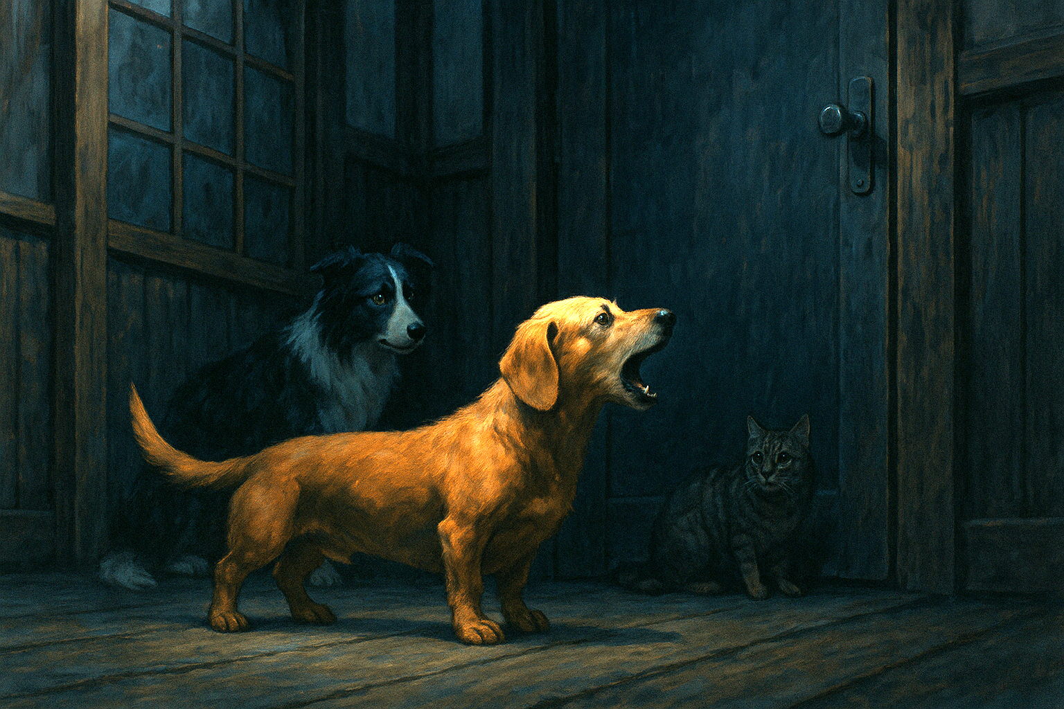奥の部屋から、ゆっくりと爪音を響かせて、十一歳のダックスフントが現れた。眠たそうに目を細め、口を大きく開けてあくびを一つ。普段なら、そのまままた寝床に戻るはずの老犬が、玄関前の騒ぎを横切るように進み、ドアの正面で止まった。