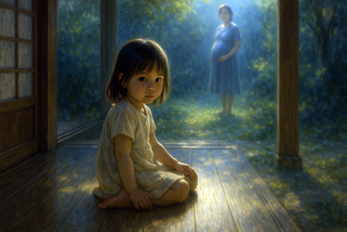 白い座布団に座り、誰かの腹を撫でている。私の手は小さく、言葉もないのに、必死に何かを伝えようとしている。相手の顔は見えない。ただ、腹の奥から、もうひとつの気配がこちらを見ている。