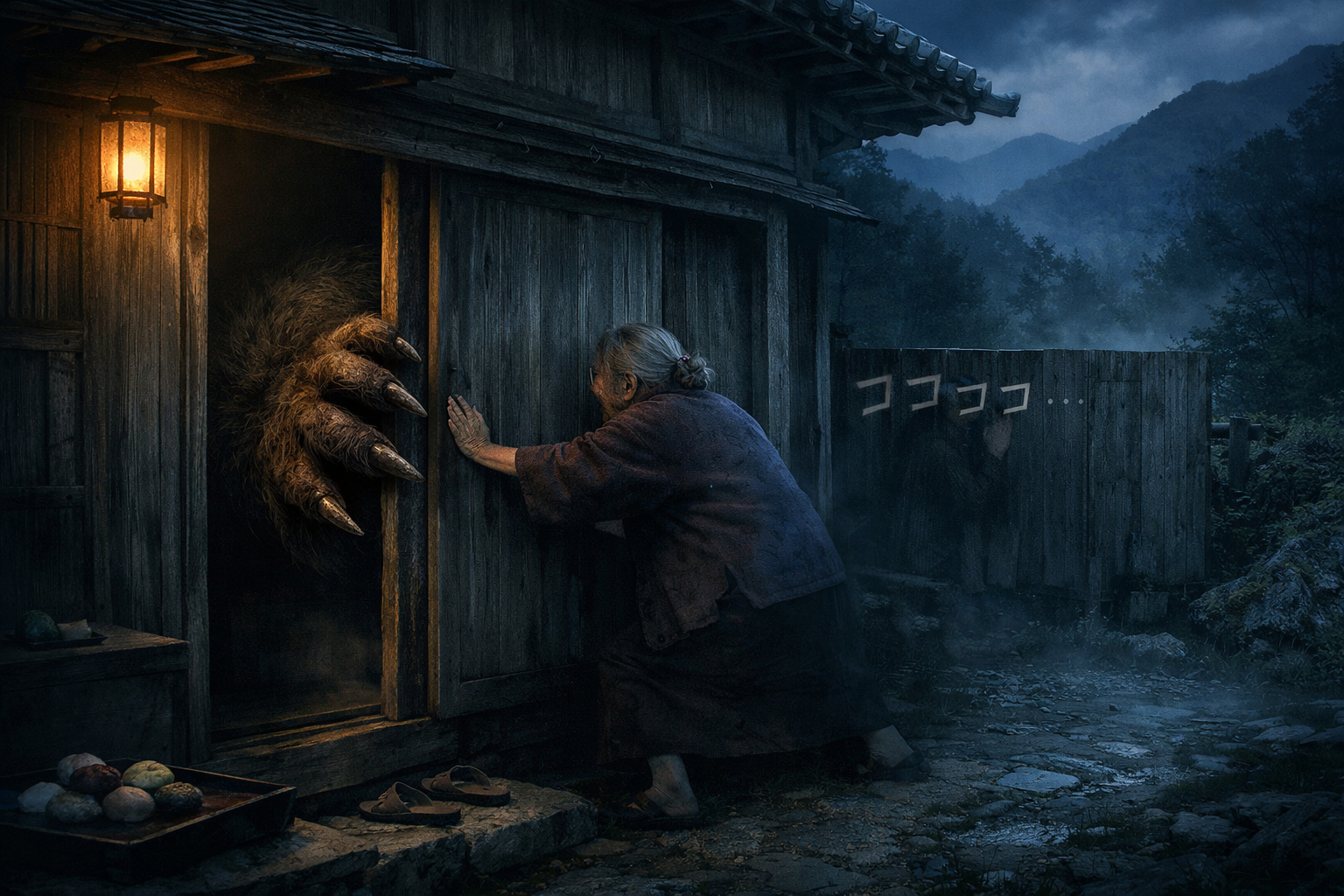 五本の指。びっしりと茶色い毛に覆われた手と腕。先の尖った爪。人間ではないと直感した瞬間、背中に冷たい汗が流れた。恐ろしい力で引きずり出されそうになったところを、大伯母が飛び込み、戸を閉めた。