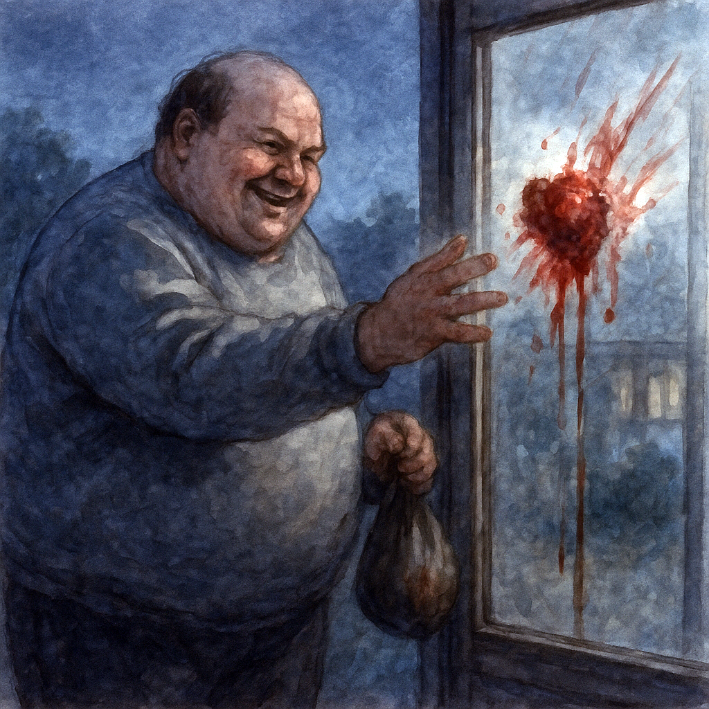灰色のトレーナーに太った体。窓越しに目が合った。男の手には袋がぶら下がっており、口から赤黒い液体が滴って畳に小さな染みを作った。男は笑いながら、中から肉片を取り出すと、窓に投げつけ始めた。