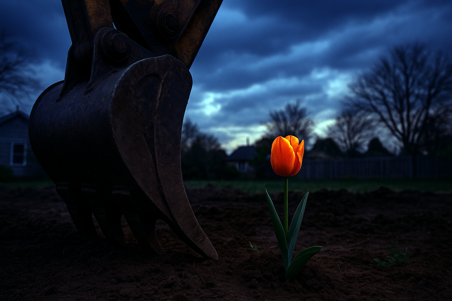 ぼんやりとそれを眺めていたときだ。オレンジ色のチューリップのすぐ脇に、ショベルカーのシャベルが突き刺さった。