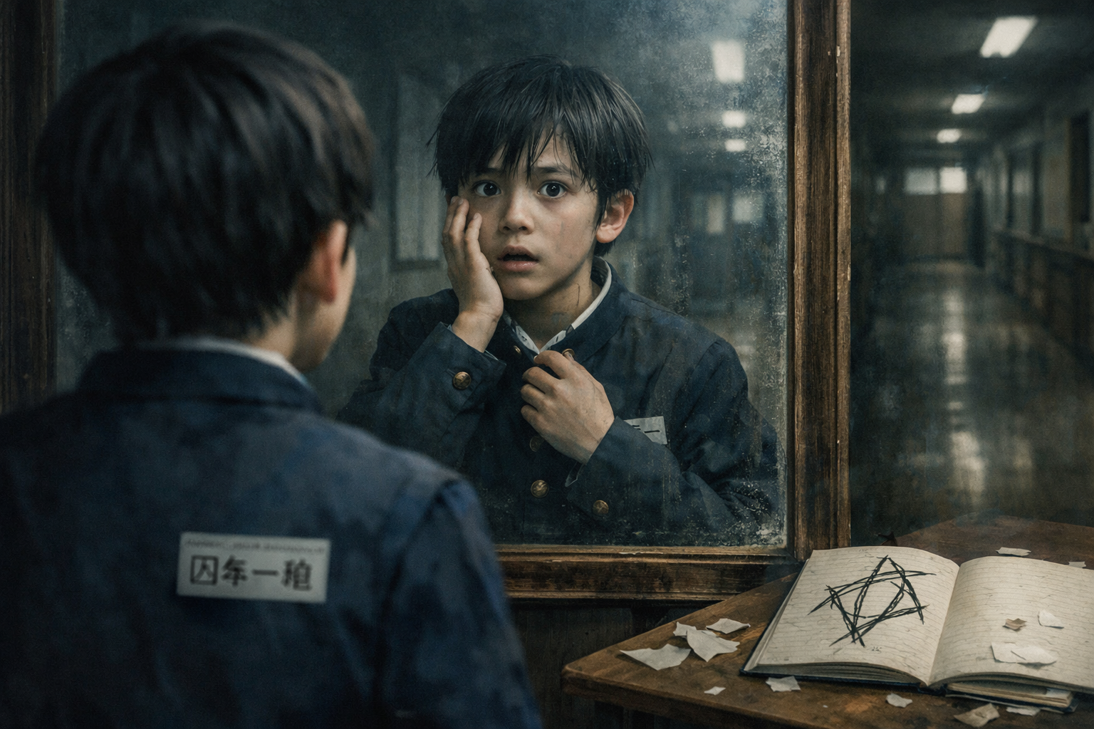 気づいたとき、私は校舎の廊下に立っていた。目の前には姿見の鏡。蛍光灯の白い光が、やけに冷たく床に落ちている。