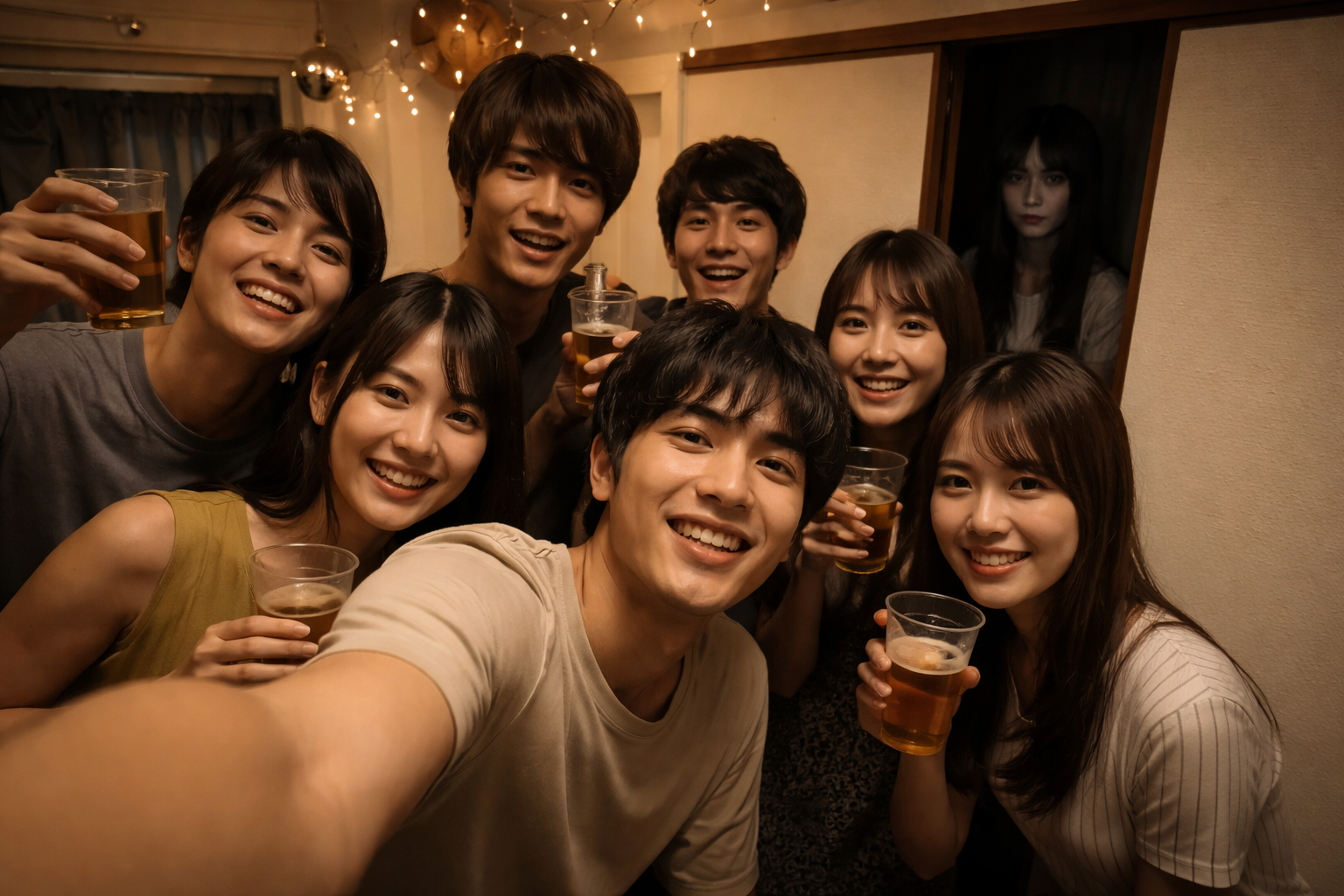 私は、自分の記憶を疑い始めた。酔いが強かったのかもしれない。何度も写真を見返す。女はどの写真にもいる。飲んでいる姿も、笑っている姿もない。ただ、どの場面でも必ず、私の近くに立っている。