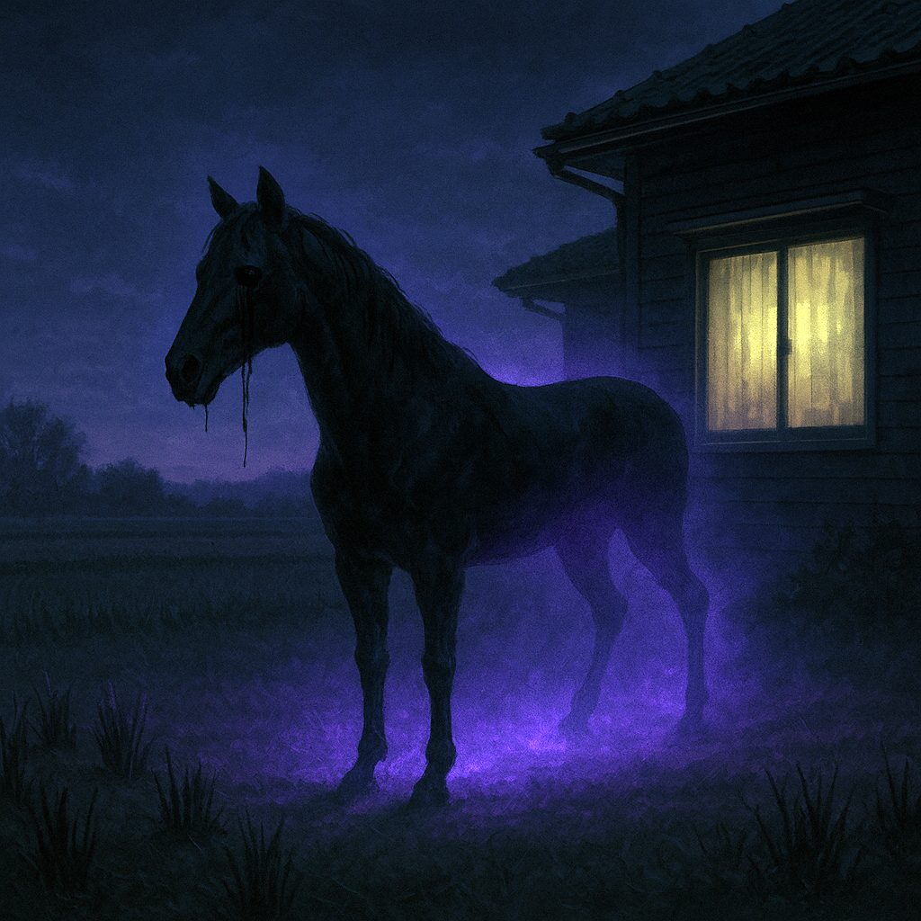 胸の奥がざわつき、カーテンの隙間から外を覗いた。そこで息を飲んだ。庭を紫色の光が照らし、その中心に立っていたのは、夕暮れに見た「後ろ半分のない馬」だった。黒い液体を目から垂らし、こちらを凝視している。まるで、私が気付くのを待っていたかのように。