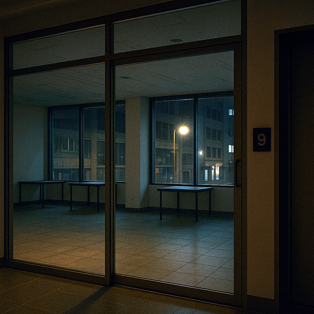 照明は落ち、フロア一面にはテーブルも椅子もなく、ただ埃っぽい匂いだけが漂っていた。人気の気配など一片もなく、まるで長年放置された廃墟の一角のように。九階で間違いないと何度も確かめながら、彼らは急ぎ足で一階に戻った。