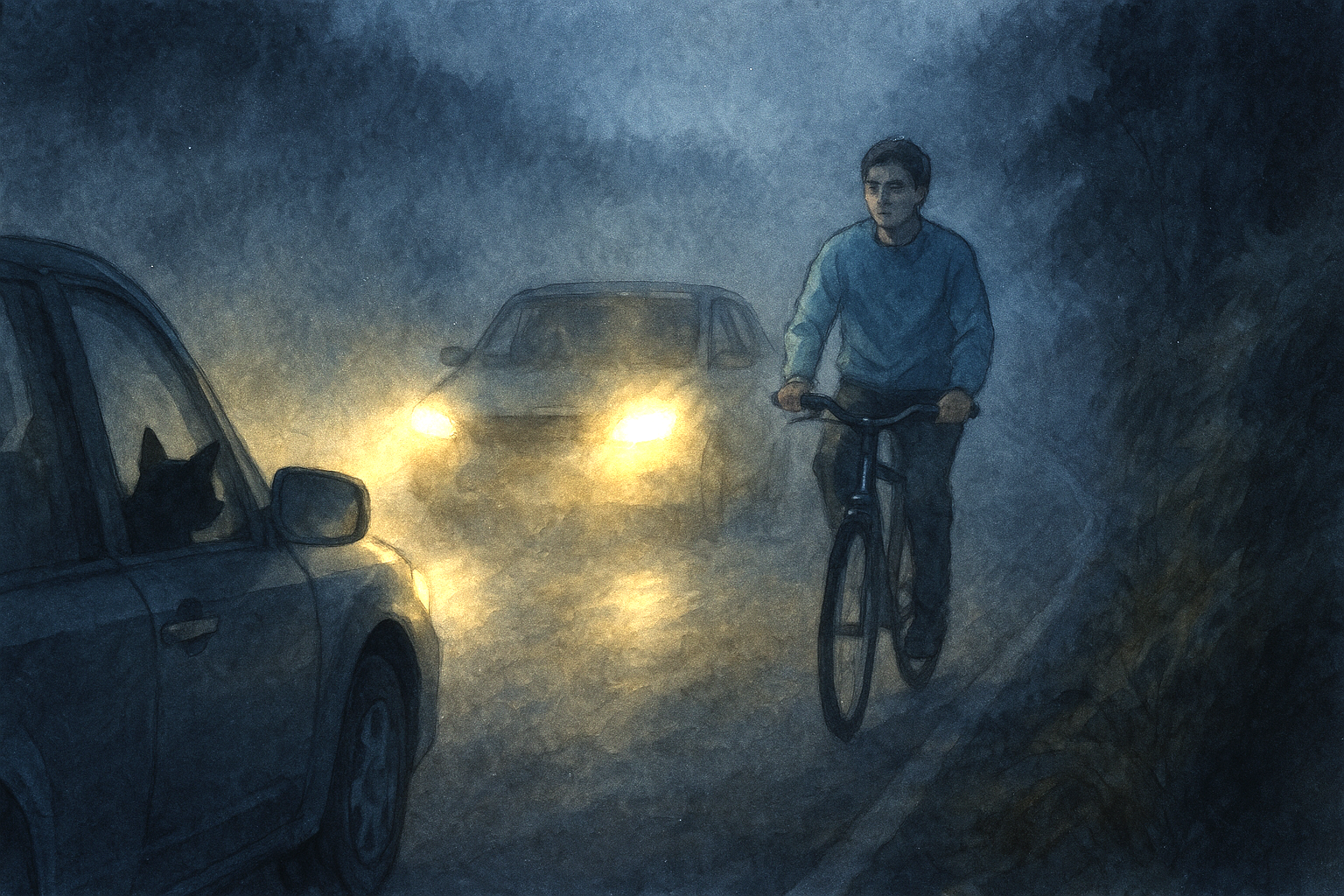 理解が追いつかなかった。ここは山奥で、自転車を走らせるような道幅はない。舗装は割れ、草が路面を覆っている。なぜ彼は倒れずに進めるのか。しかもライトに照らされたその姿は妙に鮮明で、服の色や肩の厚みまで覚えているのに、顔だけは霞んでいた。