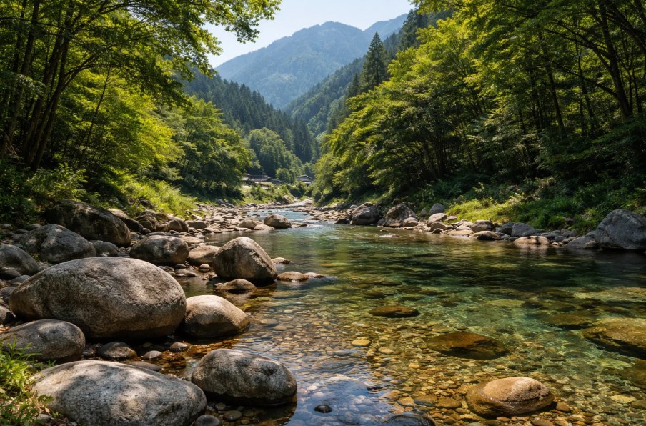 白砂利の先は斜面になっていて、下に川が流れていた。日陰の多い山間で、大きな岩が見えた。暑さに耐えきれず、全員で斜面を降りた。