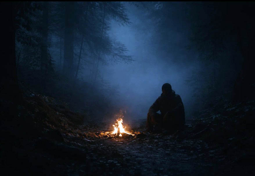 焚き火の揺れる明かりが見え、そのそばに男が一人いるのがわかった。酔いもあって警戒心は薄く、違和感を覚える前に足がそちらへ向いていた。男は焚き火の前で魚を焼いていた。