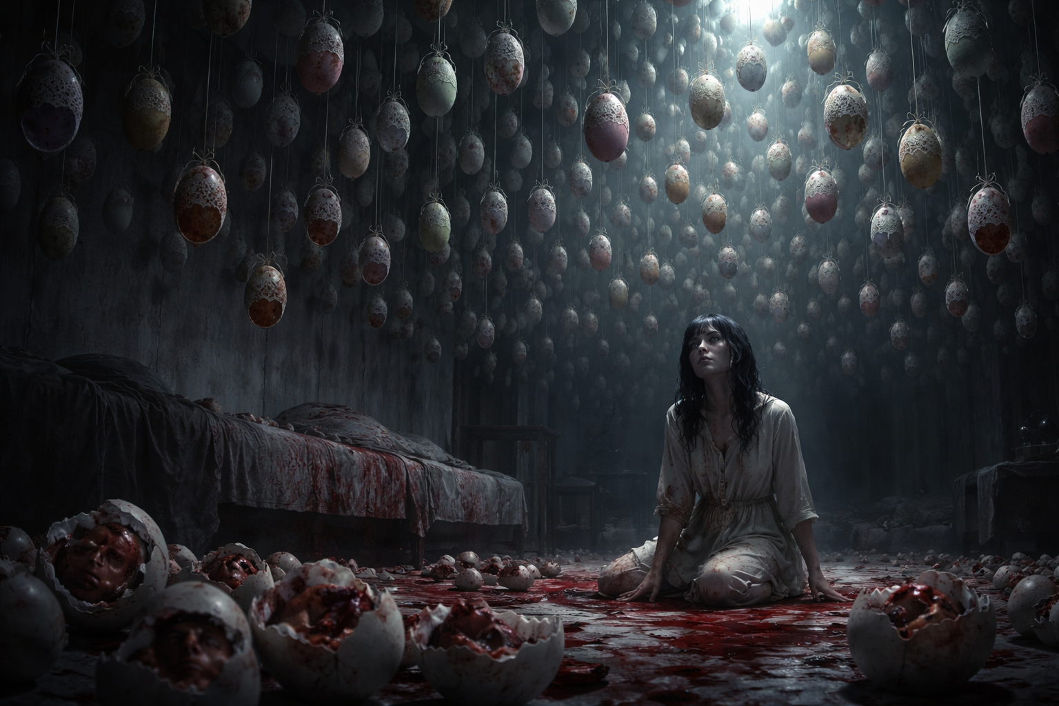 床には卵殻が散乱していた。踏まないように避けながら進むうち、母親は殻のひとつが異様に重いことに気づいた。拾い上げた瞬間、殻の中で何かがずっしりと動いた。