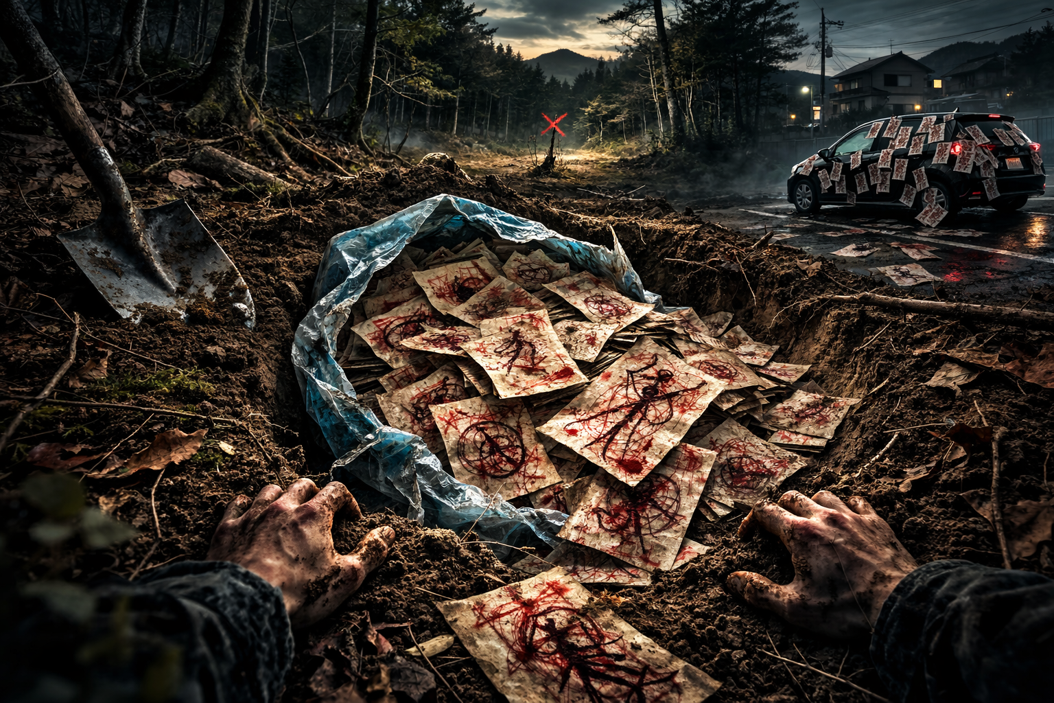 中身は札だった。金ではない。和紙に似た紙片。赤黒いインクで、意味の取れない図形と人型の歪みがびっしり描かれている。数千枚。湿気もなく、保存状態が異様に良い。