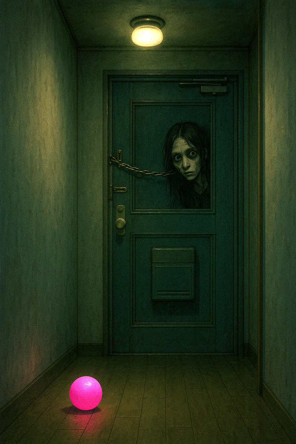 指差した先には、蛍光ピンクの小さなボールが転がっていた。不自然なまでに鮮やかで、異物感を放つ色合い。なぜこんな場所に、と訝しむ由美子さんを無視するかのように、女は「ちょっとでいいからチェーン外してくれませんか」と懇願した。拒絶すると、女の声色は変わった。